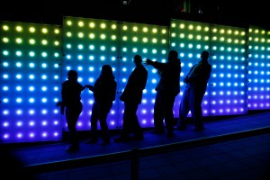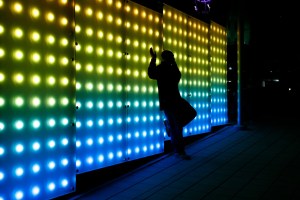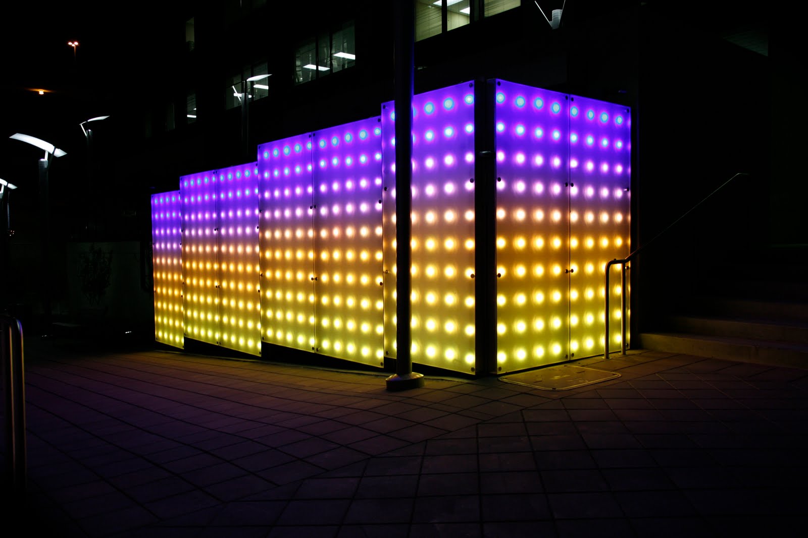 “Horizon Line”, a public art project, employs cutting-edge light technology to create two colorful, imaginative spaces for pedestrians entering and exiting City Plaza. Designed by Chapel Hill artists, Susan Harbage Page and Juan Logan in collaboration with Peter Egan, the installation of LED lighting panels conceals unsightly electrical utility equipment adjacent to the BB&T and Bank of America buildings on Raleigh’s downtown City Plaza. Horizon line’s three hour light exhibition is based on abstracted horizon lines found in North Carolina. The LED’s offer a full spectrum of colors and forms which change and shift over time.