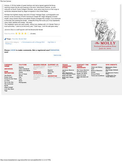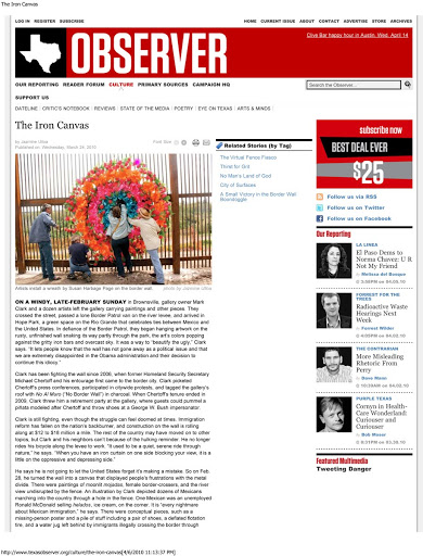 Posted on April 12, 2010October 23, 2017 by susanharbagepageblogTexas Monthly – The Iron Canvas The Iron Canvashttp://www.texasobserver.org/culture/the-iron-canvas Share this: Click to share on X (Opens in new window) X Click to share on Facebook (Opens in new window) Facebook Like Loading... Related