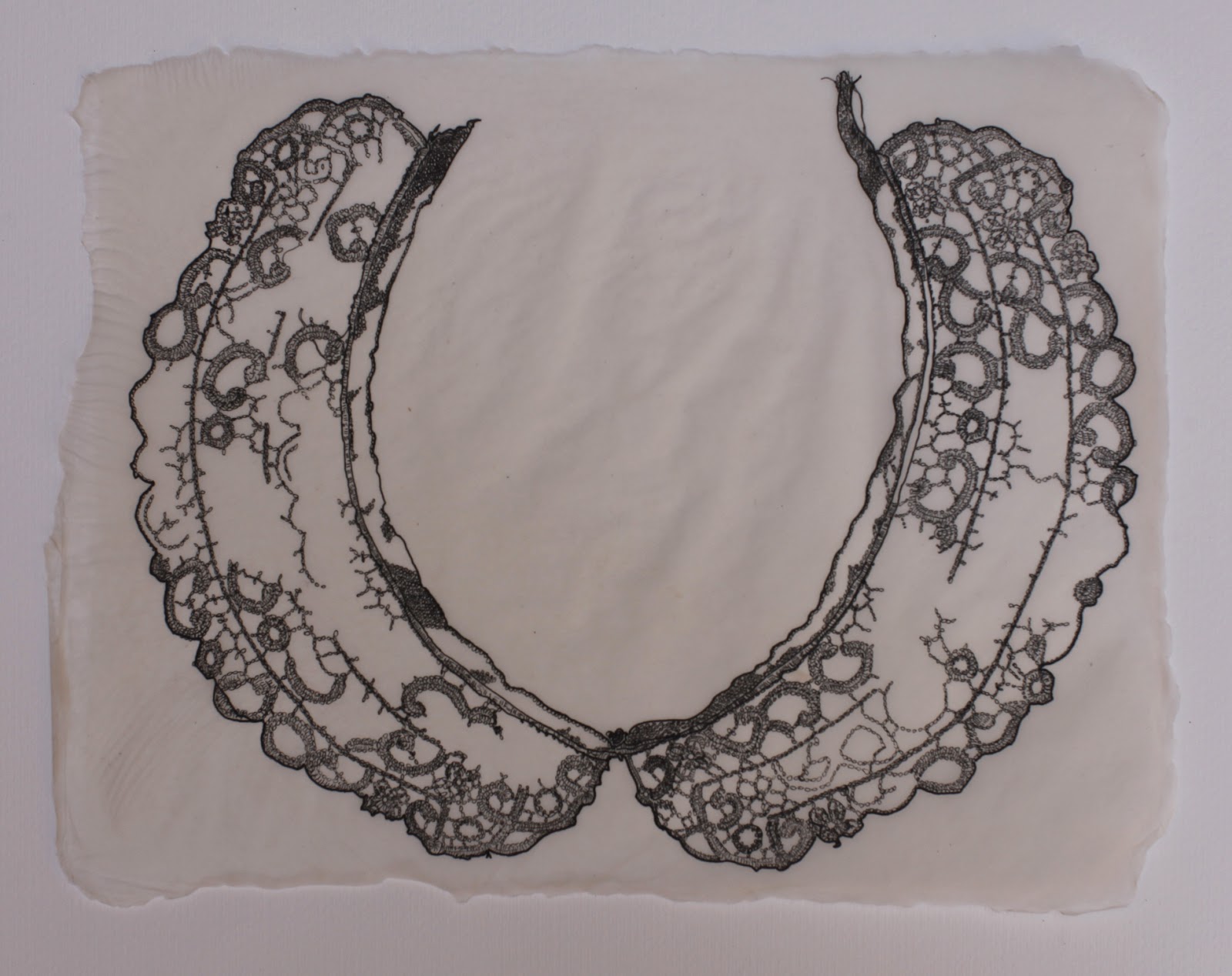 “Taking old embroideries/doilies/laces and graphically retracing their borders, Harbage Page carries out a conceptual operation. She places the embroidery or the doily under a sheet of hand-made translucent paper and, with ink that is prevalently black but also magenta, she re-codifies its design.