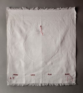 The square white or ivory colored linen clothes, folded, creased, stained, frayed, embroidered, are primitive tampons or menstrual pads that belong to the cultural history of our grandmothers. They are a representation of unspeakable secrets, relics punctuating the trail of life and death.