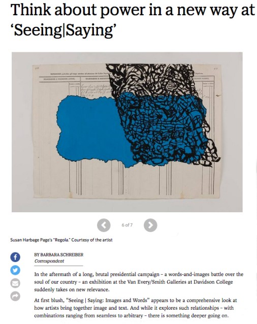 Here is a link to the article Think about power in a new way at ‘Seeing|Saying’ the current exhibition at Davidson College’s Van Every/Smith Galleries which was curated by Lia Newman and Van E. Hillard. We installed it before the election and now after the election it has a whole new read.