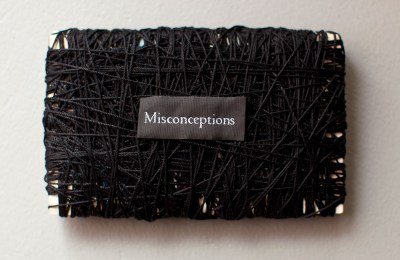 Susan Harbage Page Piccolo Monument to Misconceptions/ Piccolo Monumento ai Fraintendimenti, 2013 libro trovato (Roman Spring di Sandra Marton), cordoncino nero, etichetta per tessuti creata dall’artista |