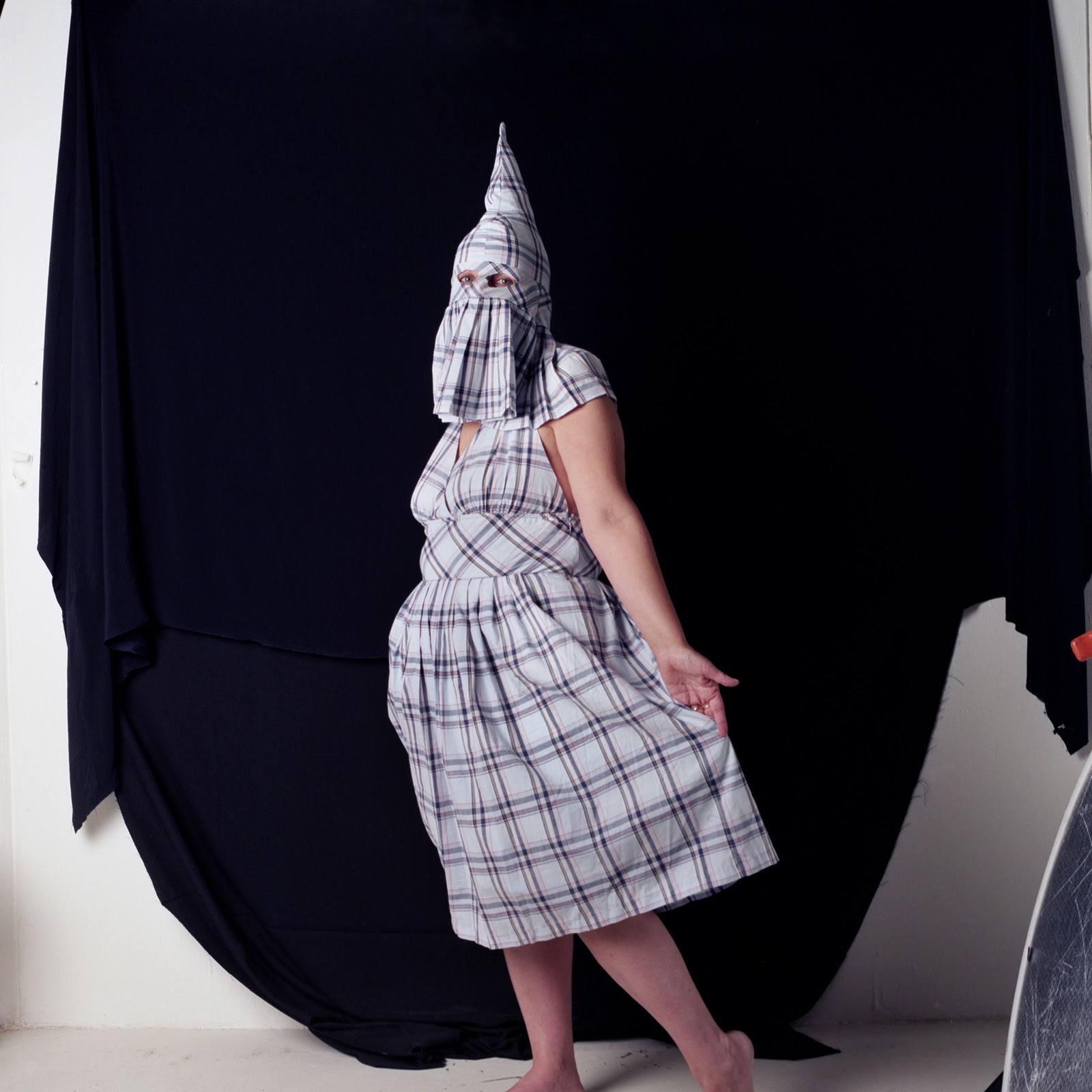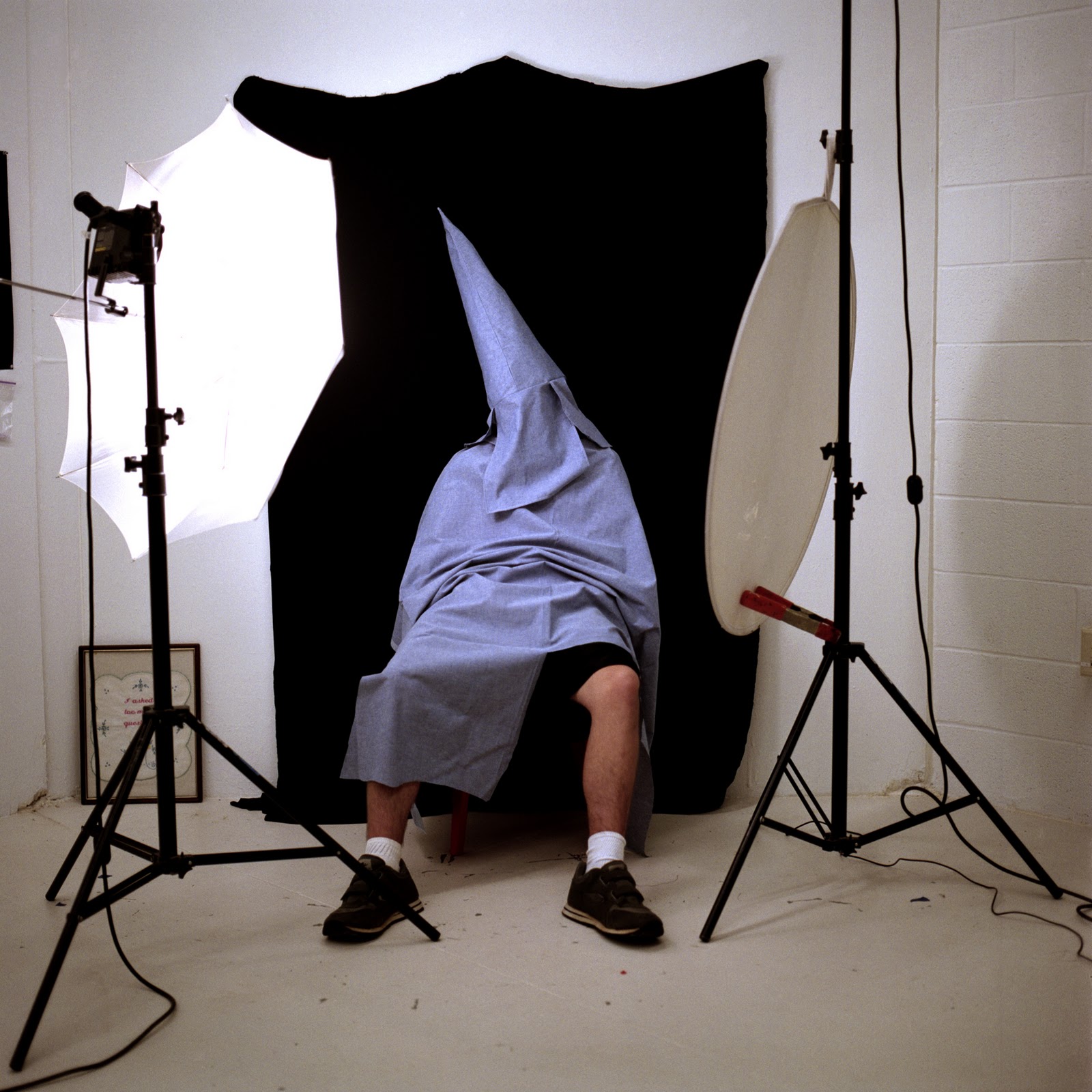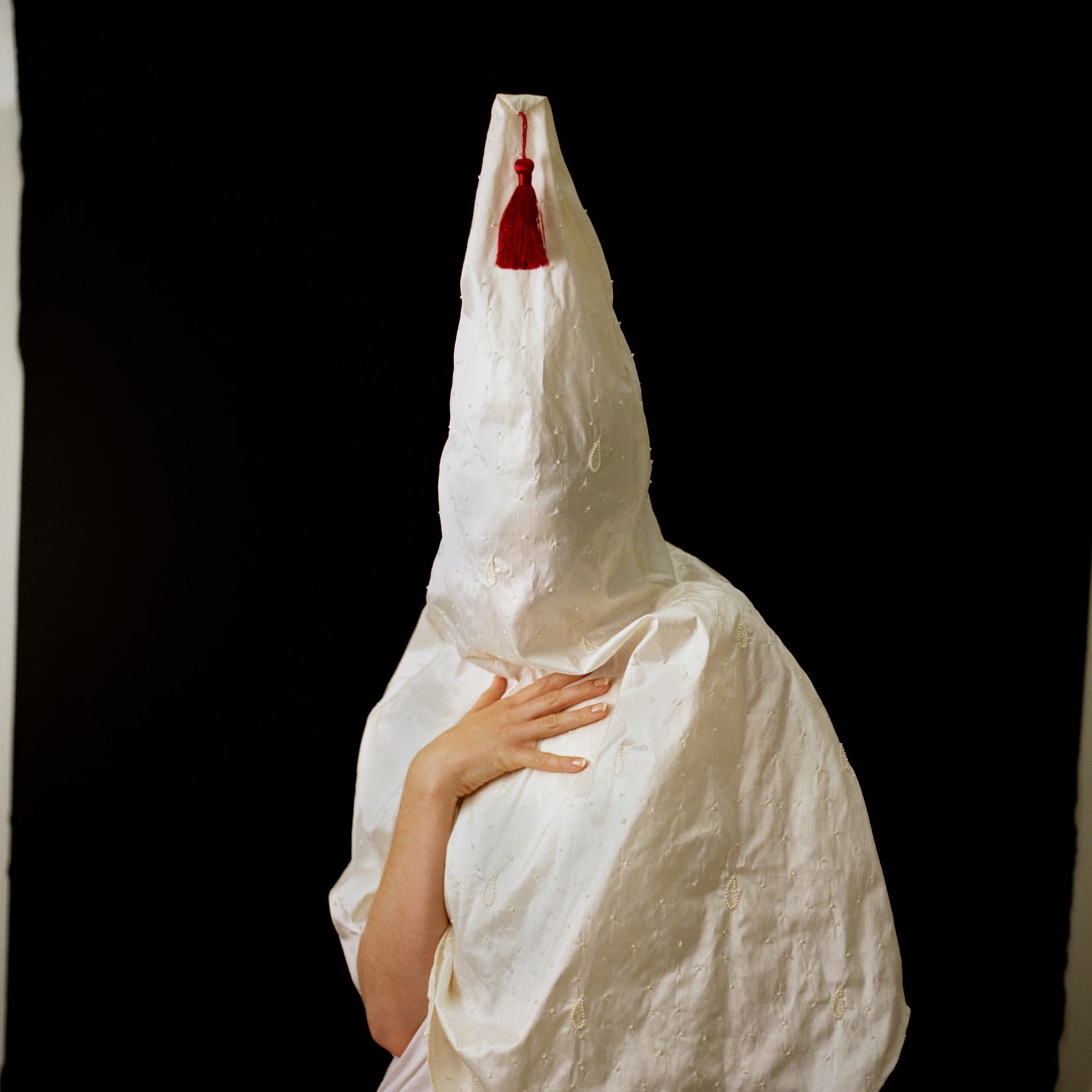 physical and metaphorical spaces. Page’s photographs of contemporary versions of Ku Klux Klan hoods and robes in the series “Postcards from Home” (2007) defy social divisions. Like many others in this region, Page, who moved to North Carolina from Ohio as a child, has grown into being a Southerner, even as she retains some identification with the North and a deep familiarity with its own forms of racism. Although almost playfully ironic, an implicit violence shadows Page’s cryptic, if lush, photographs of Klan hoods sewn from contemporary fabrics. The disguise offered by such garments confers anonymity and a perverse sense of power upon the wearer.