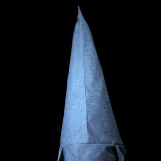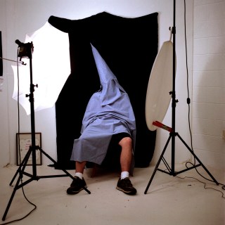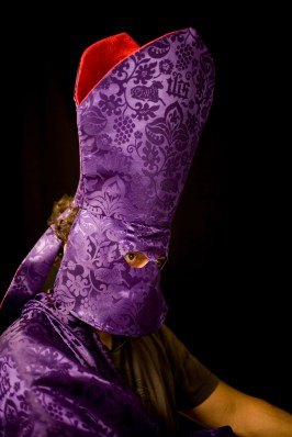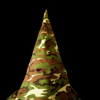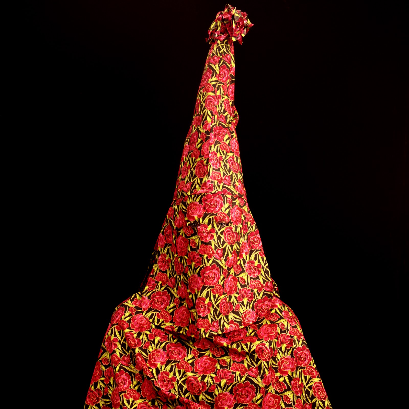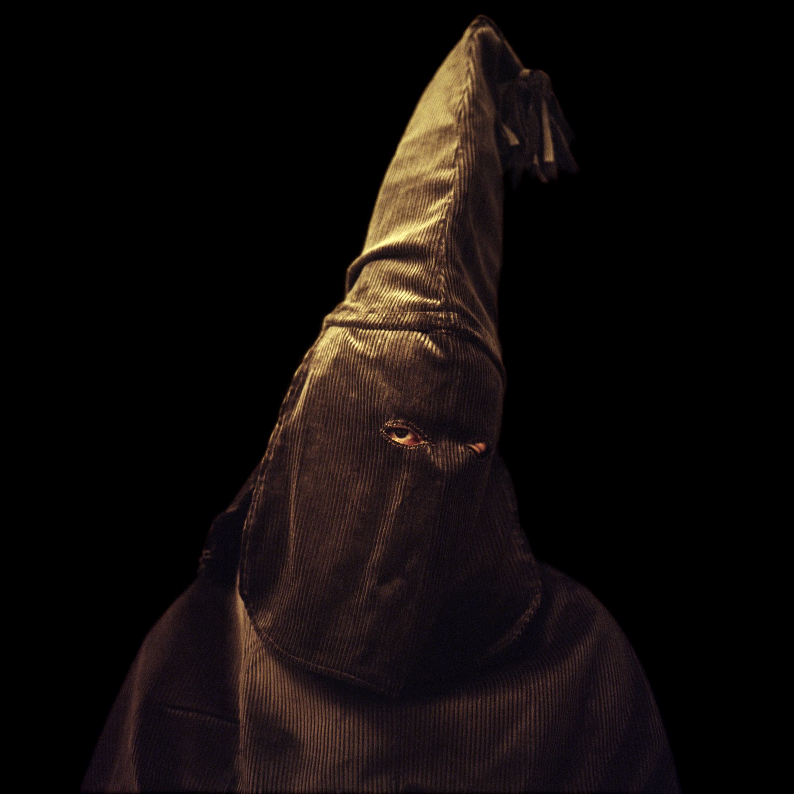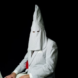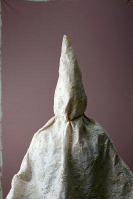 In 2007, Page began to sew her own versions of Klan hoods and robes from colorful prints, rich velvets and corduroys, decorative toiles, and conventional blue oxfords. Modeled by friends and family, these costumes form the basis for visually seductive photographs that picture a brutal history, with effects in the present. Page’s photographs unsettle any sense one may have of moral superiority, for one can imagine oneself in the place of one of her models.