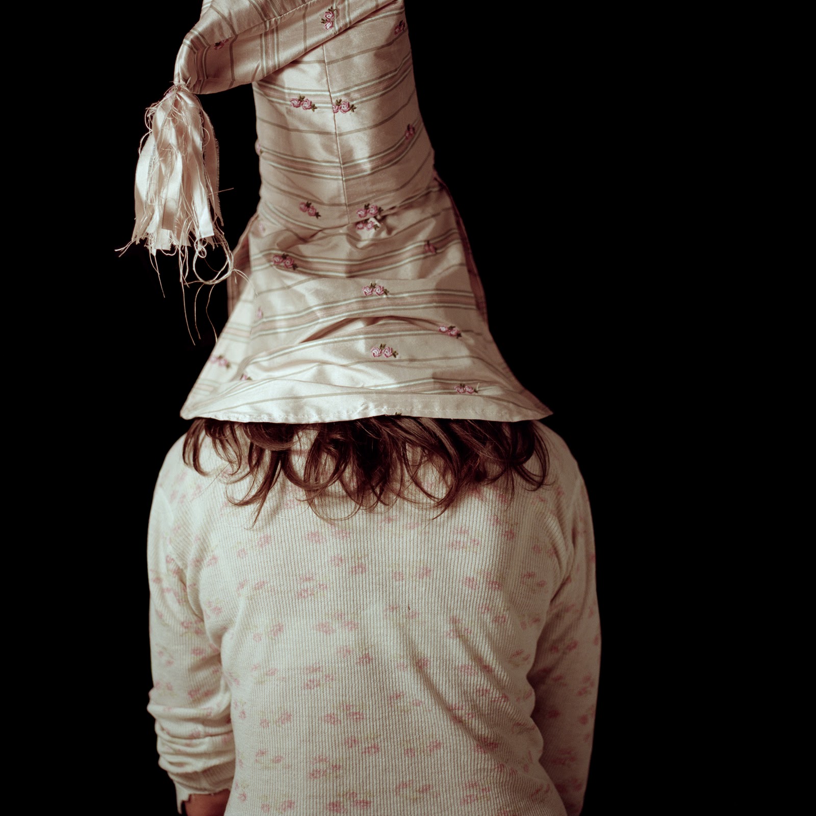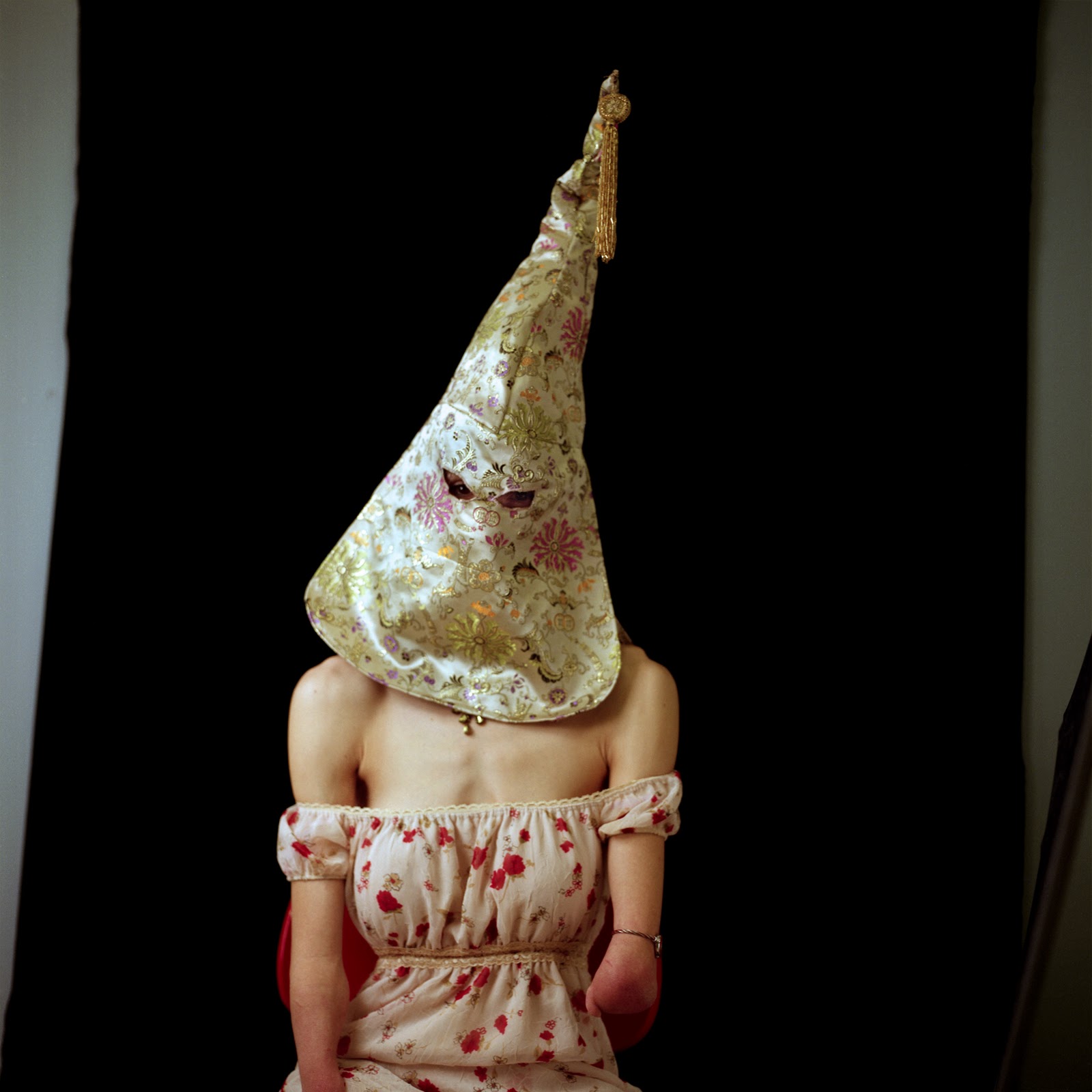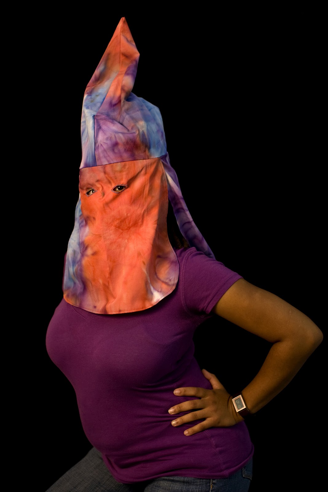 In 2007, Page began to sew her own versions of Klan hoods and robes from colorful prints, rich velvets and corduroys, decorative toiles, and conventional blue oxfords. Modeled by friends and family, these costumes form the basis for visually seductive photographs that picture a brutal history, with effects in the present. Page’s photographs unsettle any sense one may have of moral superiority, for one can imagine oneself in the place of one of her models.