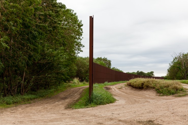 In “Here/There,” I photographed myself holding a series of signs at the border wall and on the banks of the Rio Grande/Rio Bravo in Brownsville, Texas. The signs called attention to the issues and divisions that borders create: here/there, us/them, belonging/non-belonging, access/non-access, safety/non-safety. In this image I hold up the sign “Here” while my foot is holding down the sign that says “There”. This can be read as a metaphor, if you hold someone or some country in place, your country and personhood is also held in place.