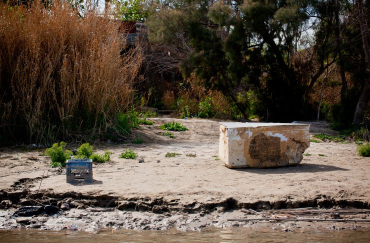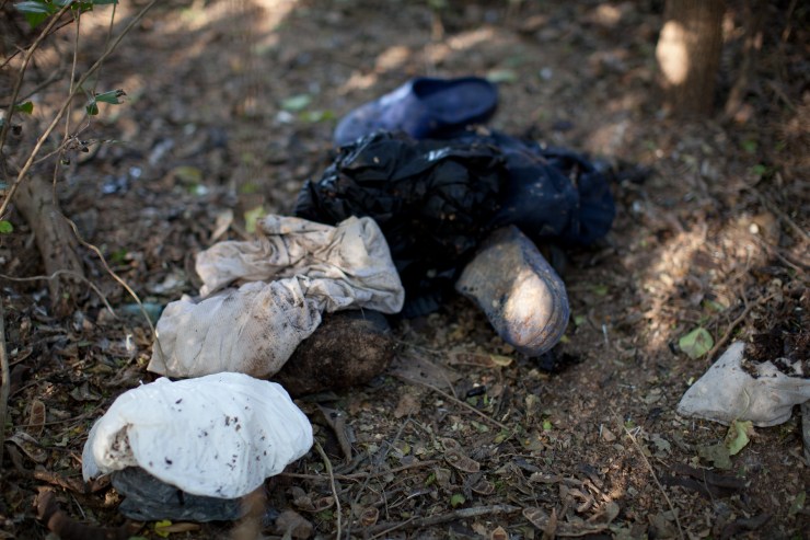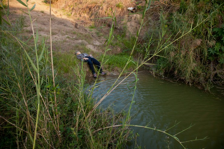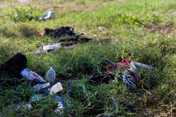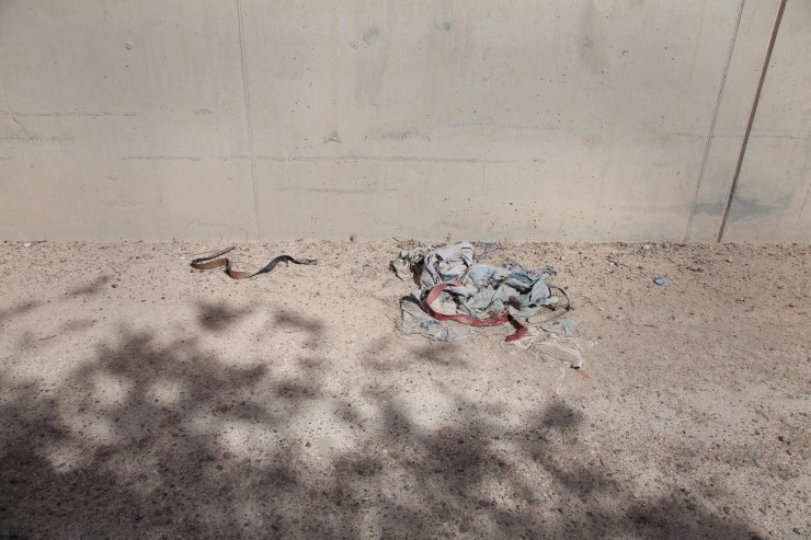 Since 2007, I have been making yearly trips/pilgrimages to walk the border and photograph objects left behind by undocumented migrants crossing the U.S–Mexico border between Matamoros, Mexico, and Brownsville, Texas. My work takes an ever-evolving imagined space and concretizes it as a collection of specific objects, first as they are found and photographed in the landscape, then as they are re-photographed (colorful backdrops counter the implication that they are evidence) and archived, and, finally, as they are united in exhibitions. The documentation of the depersonalized objects and photographs gathered over time become a new way to look at the militarization of the border and the ways in which the power of nations plays out in this contested space. In the end, it represents the fact that some people have access and others don’t. The objects I examine all have incomplete and layered narratives attached to them—for example, when a bra is found placed in a tree, it is said that a coyote (person who smuggles people across the U.S.–Mexico border) has placed it there as a sign that a woman has been raped. Barbara Sostaito writes in Feministing.Com: