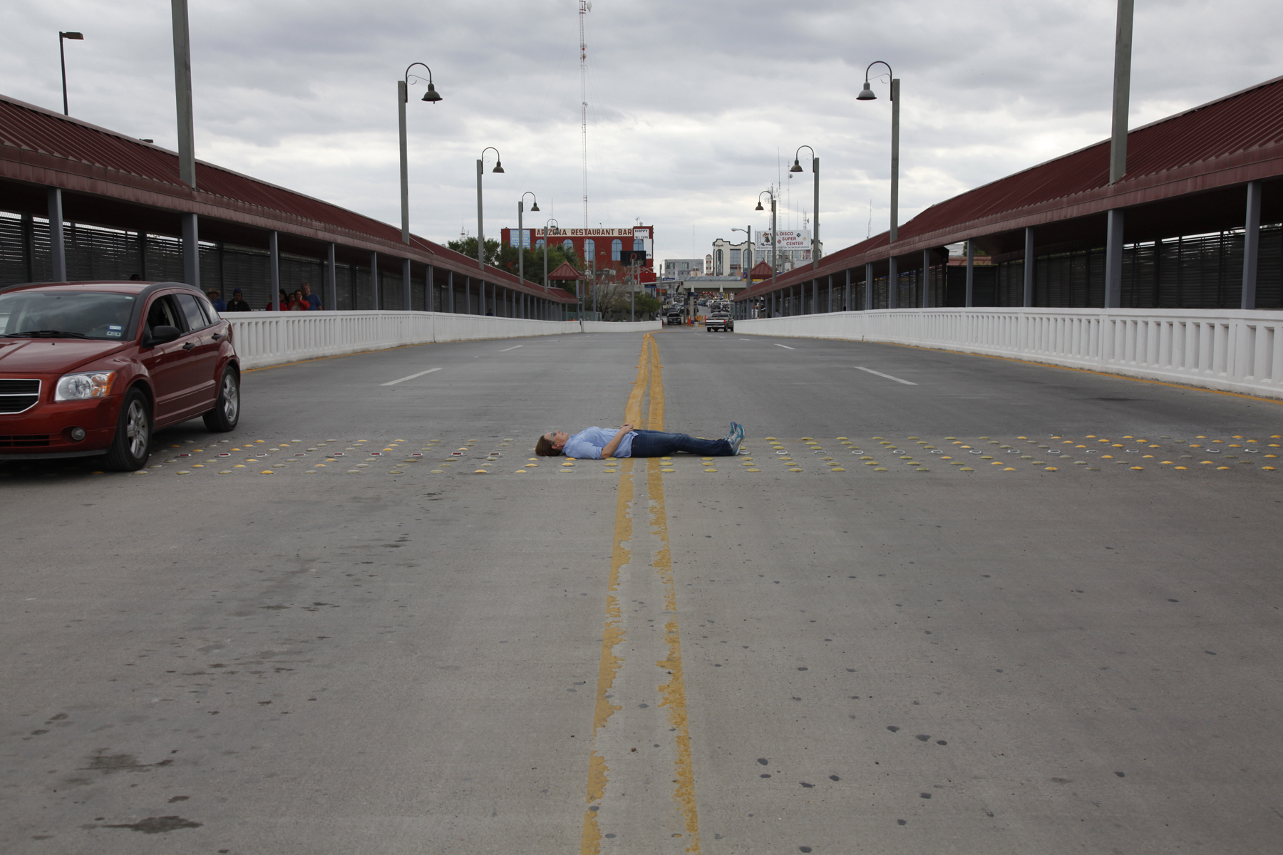 My prone, vulnerable, protesting body was dwarfed by a constructed representation of border (seven regimented rows of yellow dots indicating caution and danger) in the first action on the Progresso–Nuevo Progress Bridge between the U.S. and Mexico. I obstructed traffic, was almost hit by a car that hadn’t seen me, and was eventually chased away by the U.S. Border Patrol. The river, over which my living breathing body rested, traditionally a waterway where people come together, becomes through the creation of nations a liminal threshold of separation.
