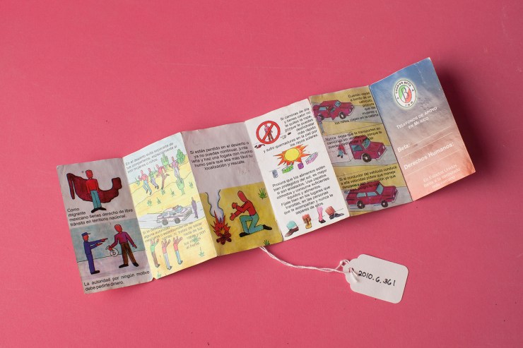 Other objects, such as lipstick, eye shadow, or a man’s razor, offer stories of self-care, normalcy, or someone trying to “fit in” after they have crossed the Rio Grande on a black inner tube and changed into dry clothes before possibly being taken to a safe house in Brownsville or McAllen, Texas. A found comb or toothbrush is a sure sign that someone has been picked up by the Border Patrol (anything short and hard is seen as a potential weapon). These present-day archeological artifacts reflect incomplete narratives and a history of flight, surveillance, and fear. We usually celebrate our histories through the objects saved and owned by the privileged. The Anti-Archive resists tradition by saving and archiving objects left behind by anonymous immigrants coming into the U.S. from Mexico.