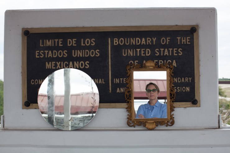 Mirrors on the Progresso asks questions about belonging: where we fit in, where we see ourselves, and what meaning that makes. What should be the basis of citizenship and who should make that decision, you or someone else? Should one’s ancestry, one’s birthplace, or one’s sense of belonging define citizenship? Should we be able to cross boundaries freely or not? I placed mirrors on the international boundary line in the middle of the Progresso–Nuevo Progresso Bridge and watched. People saw themselves reflected in the mirrors I placed over the durable and official brass plaque that declared the exact border of the United States of America and Mexico.